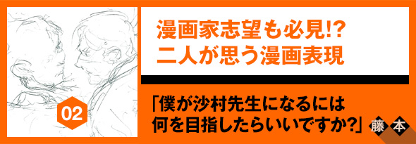 沙村:俺のスケジュールよりもあなたのスケジュールの方が絶対忙しいはずだから。気にしないでください。今回の対談で、藤本先生が若いのでアドバイスを俺からしてもらえたら、という趣旨を聞いたんですが、正直俺の経験というか漫画人生は全部月刊誌のもので。これからあなたがやっていく漫画人生のほうが絶対俺よりハードだから、あんまり言うことないなと(笑)。
